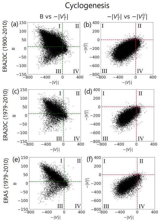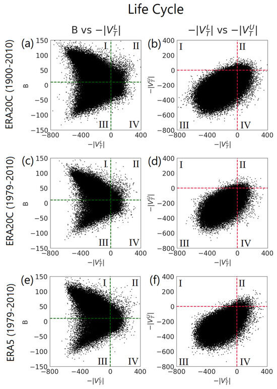 Distribution of CPS parameters for each 6-h time step across the cyclone’s lifecycle for South Atlantic: The left column shows B vs. diagrams and the right column vs. diagrams. (a,b) ERA20C (1900–2010), (c,d) ERA20C (1979–2010), and (e,f) ERA5 (1979–2010). Dotted lines indicate significant values based in C01, C02 and C03 thresholds: , and . I–IV refers to the quadrant order, from first to fourth.