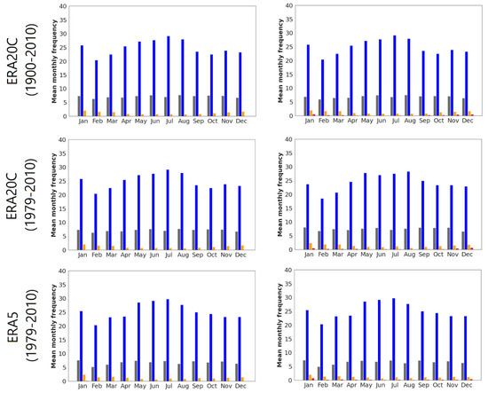 The subtropical phase identified using the C01 criterion during the common period shows that 6.1% of the time steps exhibit this feature in ERA5 and 7% in ERA20C. However, both datasets report the same percentage (~4%) for subtropical cyclogenesis. The percentage of the subtropical phase across all time steps increases by approximately 1.5% in both reanalyses when the C02 and C03 criteria are applied. However, the percentage of cyclogenesis with a subtropical phase remains similar to that identified using C01. For the 1900–2010 period, ERA20C statistics are closer to ERA5 than those of ERA20C for the 1979–2010 period. Even though the C02 and C03 criteria identified more subtropical cyclogenesis (~+0.2%) than the C01 criterion [39], the annual cycle obtained for both is similar, with higher activity in summer and fewer events in winter (Figure 10). This same feature is obtained for ERA20C in the two periods and ERA5. The average annual number of subtropical cyclogenesis in the common period is ~15, which is higher than that obtained by [7,8], and it can be associated with the use of more flexible thresholds for the three CPS parameters in comparison with those authors.