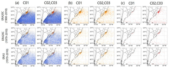 Total cyclones: Initially, there were doubts about whether ERA20C could accurately represent the climatology of cyclones in the South Atlantic, given that its construction relies solely on surface pressure and near-surface wind observations [36], which are scarce data in this region. However, the results indicated that the cyclogenesis and trajectory densities of all cyclones were very similar between ERA20C and ERA5. Additionally, ERA20C and ERA5 presented very similar monthly and annual mean frequency of cyclones over the South Atlantic Ocean (391.7 in ERA20C and 389.9 in ERA5). The regions with the highest cyclogenesis density align with findings in the literature [3,45], showing higher density in ARG compared to the other subregions, SEB and URU.