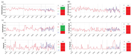 Annual frequency of the time steps with extratropical (a,b), subtropical (c,d), and tropical (e,f) phases (left panel) and the same just for cyclogenesis (right panel) in the South Atlantic for ERA20C (red) and ERA5 (blue). “R” is the slope of the trend lines: ERA20C (1900–2010) is represented in red, ERA20C (1979–2010) in green, and ERA5 (1979–2010) in blue. “MK” is the Mann-Kendall test at a 95% confidence level, and the colours green and red indicate, respectively, statistically significant and non-significant trends.