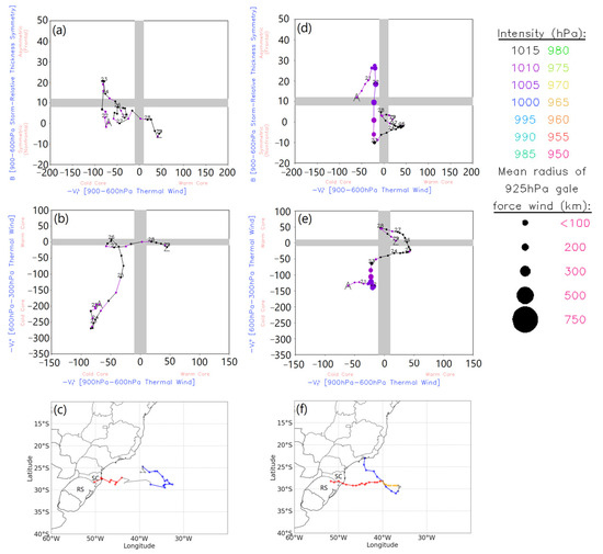 CPS for Hurricane Catarina over the South Atlantic Ocean in March 2004: for (a,b) ERA20C (left panel) and (d,e) ERA5 (right panel); (c,f) depict the hurricane tracking, with the colors indicating the phases of the system: extratropical in blue, subtropical in orange, tropical in red and “other” in gray. In these same panels “SC” and “RS” indicate, respectively, Santa Catarina and Rio Grande do Sul states, where Hurricane Catarina had landfall.