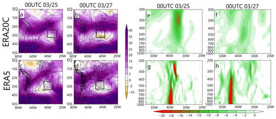 Hurricane Catarina: atmospheric fields for ERA20C (upper panels) and ERA5 (lower panels): (a–d) mean sea level pressure (hPa—black contour), zonal wind at 200 hPa (m s−1; shaded), and Catarina position limited by black square, and (e–h) vertical cross sections of cyclonic relative vorticity (×10−5 s−1; shaded) considering the central latitude of Catarina.
