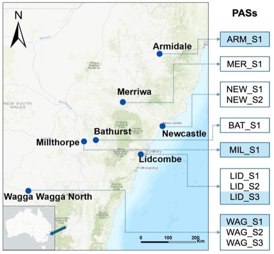 The NSW Department of Climate Change, Energy, the Environment and Water (DCCEEW) manages a comprehensive network of air quality monitoring stations (AQMS) throughout NSW (https://www.airquality.nsw.gov.au/ (accessed on 30 July 2024)). As noted earlier, over a hundred PASs have been deployed within different airsheds across NSW, including sensors collocated at some compliance (reference) air monitoring stations so that direct comparison or correction can be made to improve the accuracy of PAS data, and those (majority) installed through voluntary citizens and located in areas where there are no governmentoperated stations.