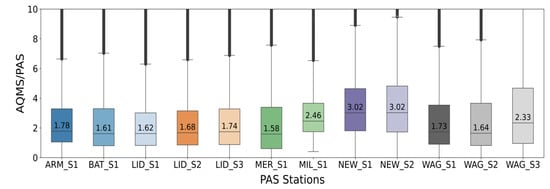 Boxplots of PM 2.5 data ratio between AQMS and collocated PAS readings (horizontal line in the box indicates median value position).