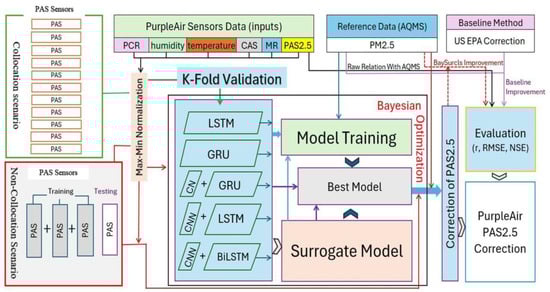 Lowcost sensors are widely used for air quality monitoring due to their affordability, portability and easy maintenance. However, the performance of such sensors, such as PurpleAir Sensors (PAS), is often affected by changes in environmental (e.g., temperature and humidity) or emission conditions, and hence the resulting measurements require corrections to ensure accuracy and validity. Traditional correction methods, like those developed by the USEPA, have limitations, particularly for applications to geographically diverse settings and sensors with no collocated referenced monitoring stations available. This study introduces BaySurcls, a Bayesianoptimised surrogate model integrating deep learning (DL) algorithms to improve the PurpleAir sensor PM2.5 (PAS2.5) measurement accuracy. The framework incorporates environmental variables such as humidity and temperature alongside aerosol characteristics, to refine sensor readings. The BaySurcls model corrects the PAS2.5 data for both collocated and noncollocated monitoring scenarios. In a case study across multiple locations in New South Wales, Australia, BaySurcls demonstrated significant improvements over traditional correction methods, including the USEPA model. BaySurcls reduced root mean square error (RMSE) by an average of 20% in collocated scenarios, with reductions of up to 25% in highvariation sites. Additionally, BaySurcls achieved Nash–Sutcliffe Efficiency (NSE) scores as high as 0.88 in collocated cases, compared to scores below 0.4 for the USEPA method. In noncollocated scenarios, BaySurcls maintained NSE values between 0.60 and 0.78, outperforming standalone models. This improvement is evident across multiple locations in New South Wales, Australia, demonstrating the model’s adaptability. The findings confirm BaySurcls as a promising solution for improving the reliability of lowcost sensor data, thus facilitating its valid use in air quality research, impact assessment, and environmental management.