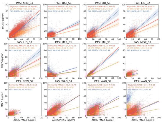 Here, we took a closer look at how BaySurcls performs against the USEPA correction method by examining RMSE and R for each sensor. Scatter plots comparing corrected PAS data to reference AQMS data highlighted the difference between BaySurcls and the USEPA method (Figure 5). For example, for sensor ARM_S1, the PAS RMSE is 5.45 µg/m3, which worsens significantly to 8.56 µg/m3 after correction with the USEPA method. In contrast, the BaySurcls model can reduce the PAS RMSE to 4.59 µg/m3, an improvement of 15.78% compared to PAS. This dramatic difference highlights the limitations of the EPA correction method for certain sensors or locations in the study region. Other sensors, such as LID_S2 and LID_S3, show similar RMSE patterns. Overall, these results clearly demonstrate the significant improvement in PAS2.5 correction achieved by applying the BaySurcls model under the collocation scenario.