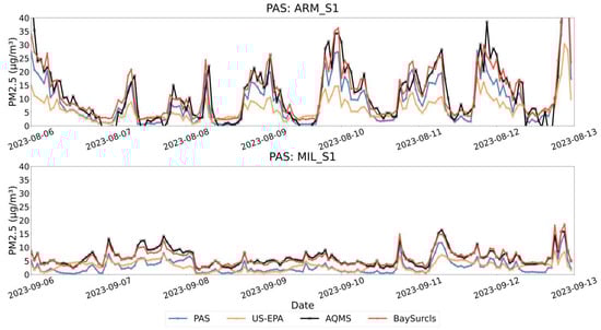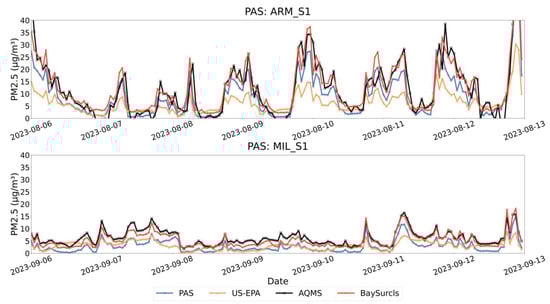 In the second case (Figure 6 bottom panel), ambient PM2.5 levels were relatively low, and there were systematic discrepancies between PAS and reference monitoring data (MIL_S1, NEW_S2). The BaySurcls correction substantially reduced the errors (bias) in PAS data, resulting in better alignment with the reference values in the timeexamined period. However, PAS data corrected with the USEPA method still show notable discrepancies from the reference PM2.5 values, with small changes observed from the correction.