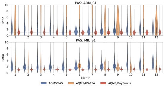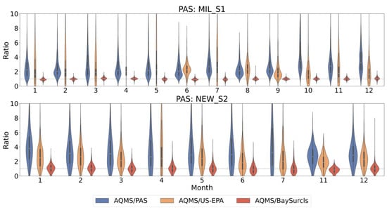 Violin plot presents the monthly distribution of the ratio between PM2.5/PAS PM2.5 and PM2.5/BaySurclscalibrated PM2.5 for selected noncollocated sensors.