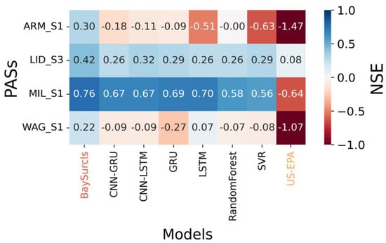 We first compare the correction performance of BaySurcls model against the ML/DLbased models and the USEPA method for correcting PAS data where collocated compliance monitoring (reference data) exists. Figure 4 shows NSE values (details in Section 2.4.3), for each individual sensor across the different models/methods. The larger the NSE value, the more efficient the correction method; and vice versa. Our BaySurcls model consistently achieved the highest NSE values at all monitoring stations, indicating that it outperformed both the standalone ML/DL models and the USEPA method.