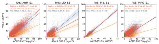 Scatter plots demonstrating the correlation between the reference PM2.5 data and (1) the raw PAS2.5 data (blue); (2) the corrected PAS data with the USEPA method (orange); and (3) the corrected PMS2.5 with the BaySurcls model (red).