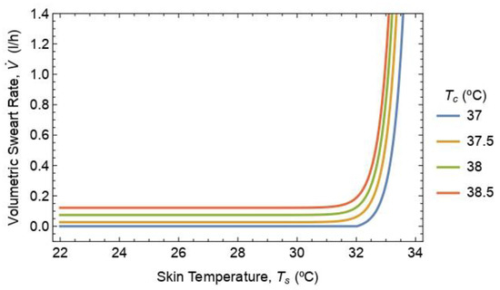 where represents the body core temperature and is the skin temperature, valid for body temperatures above 36.5 °C. This expression shows that the sweat rate increases exponentially with skin temperature once it exceeds 32 °C, as can be seen in Figure 1.