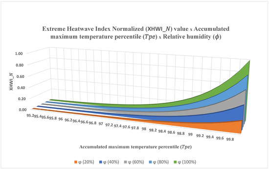 Accordingly, Equation (13) presents a proposed normalization for the index (, assuming the minimum relative humidity () is 1%. This value was chosen to ensure that the index can be applied anywhere in the world. While the minimum relative humidity during an XHW episode typically ranges between 10% and 12% [41], relative humidity values slightly below 1% have been observed in places like Nevada, USA, and Iran [42]. This justifies the selection of this value.