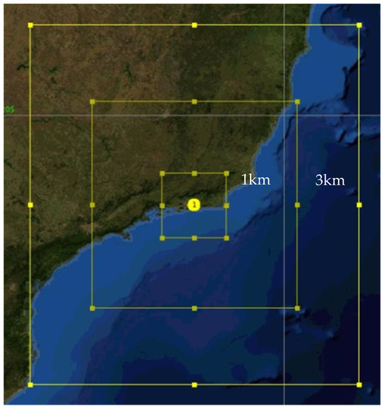 To evaluate the application of the XHWI under weather forecast conditions, the WRF model [51] was run with the domain illustrated in Figure 3, with a spatial resolution of 1 km for the metropolitan region of Rio de Janeiro (mesh 1), using the set of physical parameterizations shown in Table 1. The spatial resolution decay relationship between the grids was 9 km–3 km–1 km.