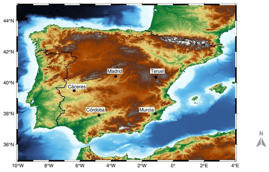 In order to evaluate the application of the index for climate studies, the index was calibrated for five cities in Spain (Figure 4), during the period of 1960 to 1990, using ERA5 data. For this work, the calibration considered all days in June, July, and August to compose the distribution of accumulated maximum temperatures.