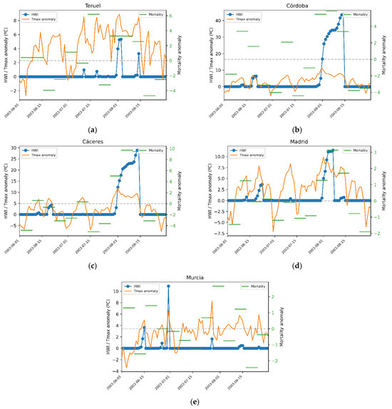 -Example of applying the XHWI for detecting HW episodes during the summer of 2003 in the cities of Teruel (a), Córdoba (b), Cáceres (c), Madrid (d), and Murcia (e).