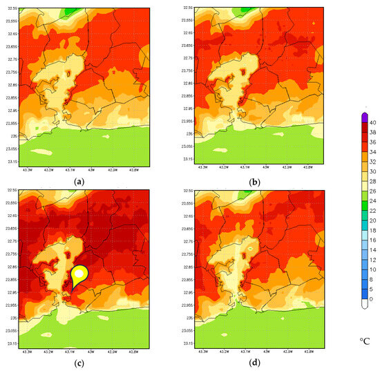 The following data present temperature forecast results obtained from the WRF simulations for 3 PM on 15 to 18 March 2024, in the metropolitan region of Rio de Janeiro, as shown in Figure 6. Special attention should be given to 17 March, which recorded the highest temperatures.