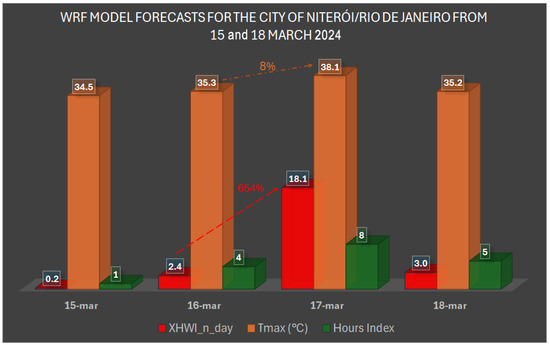 Simulated values by the WRF of maximum temperature, hours when the XHW index was greater than zero, and the value of for the period between 15 and 18 March 2024.