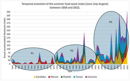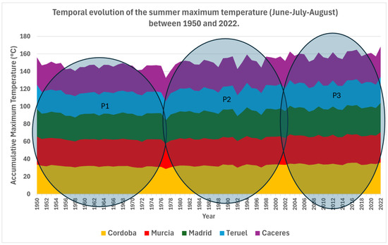 As mentioned in Section 3.4, the value was accumulated annually for the cities of Murcia, Córdoba, Madrid, Teruel, and Cáceres in Spain to evaluate its annual behavior, specifically the accumulated values for June, July, and August, during the period from 1950 to 2022.