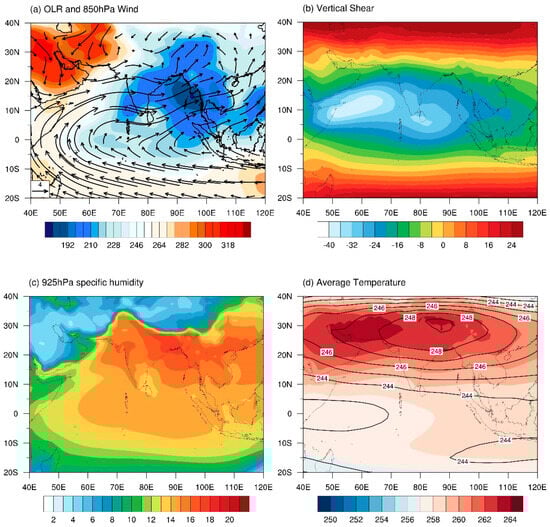 The climatological JJA mean patterns of (a) OLR (shading; W m−2) and 850-hPa wind (vector; m s−1) fields; (b) vertical wind shear (shading; m s−1) obtained by subtracting 850-hPa zonal wind from 200-hPa zonal wind; (c) 925-hPa specific humidity (shading; g kg−1); and (d) the temperature averaged from 850-hPa to 200-hPa (shading; K) and from 500-hPa to 200-hPa (contour; K).