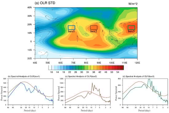 (a) The standard deviation of daily OLR anomalies (shading; W m−2). The blue, brown, and green boxes denote three significant OLR variability centers. (b–d) Power spectra of daily OLR anomalies averaged over the three boxes: 14–18° N, 67–71° E (blue box), 14–18° N, 83–87° E (brown box), and 14–18° N, 113–117° E (green box), respectively. The dashed red curves denote the 95% confidence level.