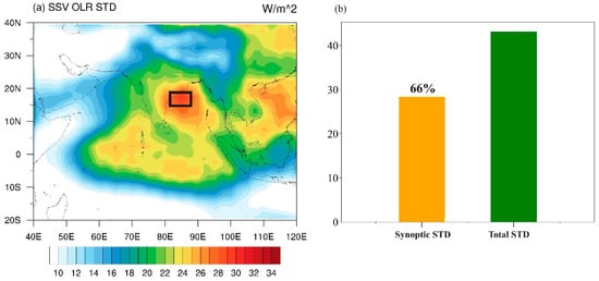 (a) The standard deviation of synoptic-scale OLR (shading; W m−2) field; and (b) the standard deviation of synoptic-scale (orange bar) and total (green bar) OLR (unit: W m−2) fields averaged over 14–18° N, 83–87° E (i.e., the black box shown in Figure 3a).
