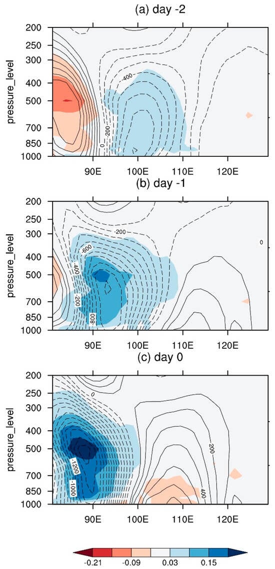At day 0, the synoptic-scale disturbance reaches its maximum as both the convective center and the specific humidity center move to near 18° N, 85° E (Figure 4c,f). Meanwhile, the low-pressure system to their east also attains maximum amplitude, accompanied by a strong cyclonic circulation.