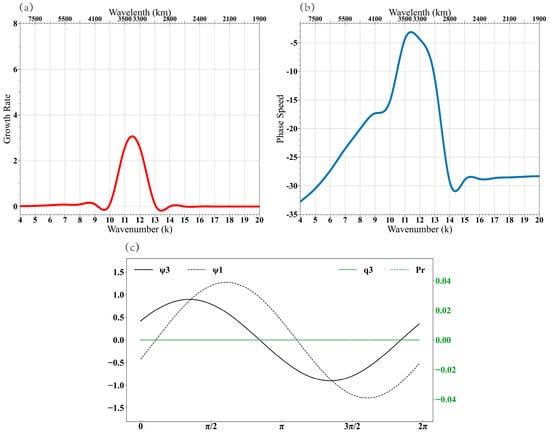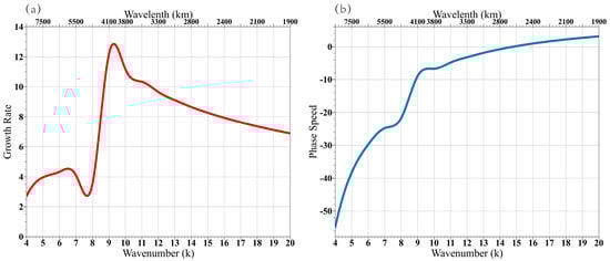(a) Growth rate (unit: 10−6 s−1); and (b) phase speed (unit: m s−1) as a function of zonal wavenumber (k) derived from the current theoretical model.