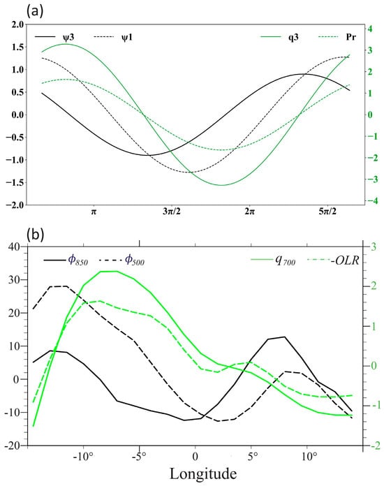 (a) Zonal phase relations among lower-tropospheric stream-function (unit: 107 m2 s−1), upper-tropospheric stream-function (unit: 107 m2 s−1), lower-tropospheric specific humidity (unit: g kg−1) and precipitation (unit: mm day−1) derived from the theoretical model. (b) Zonal phase relations of observed synoptic-scale geopotential height fields at 850 hPa and 500 hPa (unit: m2 s−2), specific humidity at 700 hPa (: unit: 10−1 g kg−1) and -OLR (shading; 101 W m−2) derived based on the composite of day −1 and day 0 in Figure 5, with the low-level low-pressure center as a reference longitude.