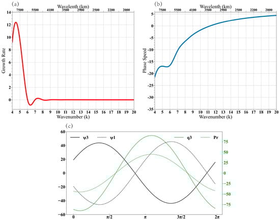 (a) Growth rate (unit: 10−6 s−1); and (b) phase speed (unit: m s−1) as a function of zonal wavenumber (k) derived from the current model in the absence of background vertical shear with U1 = U3 = −3.5 m s−1; (c) corresponding zonal phase relations among lower and upper stream-function and (unit: 107 m2 s−1), lower-tropospheric specific humidity (unit: g kg−1) and (unit: mm day−1) for the most unstable mode in the absence of background vertical shear with U1 = U3 = −3.5 m s−1.