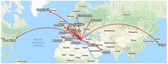 Based on the aforementioned results, an analysis was performed and a total of fourteen flights towards various popular international destinations from Athens International Airport Eleftherios Venizelos were studied in this work. More specifically, eleven flights were considered for destinations in Europe (Larnaca, Rome, Berlin, Brussels, Paris, Amsterdam, Moscow, Madrid, London, Stockholm, and Reykjavik), two for destinations in Asia (Dubai and Tokyo), and one for a destination in North America (New York). All the necessary information concerning the airports that were used in this study, such as the name, city, International Civil Aviation Organization (ICAO) abbreviation names, and geographical coordinates, is given in Table 1.