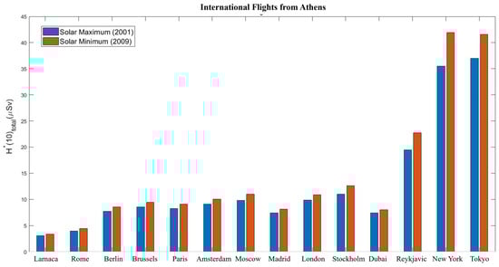 The total ambient dose equivalent H*(10) for international flights from Athens for solar maximum and solar minimum conditions (2001 and 2009, respectively) as estimated by DYASTIMA-R.