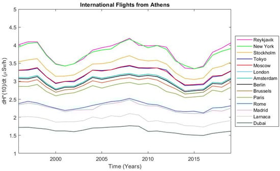 Consequently, in addition to the total dose, it is instructive to also estimate the ambient dose equivalent rate dH*(10)/dt during a flight. In order to achieve that, the total dose is divided by the time duration of each flight. The results are shown in Figure 3, for the time period 1996–2019, also known as Solar Cycles 23 and 24. The lowest ambient dose equivalent rate is observed on the Athens–Dubai flight while the highest dose rate is observed on the Athens–Reykjavik flight. This is because Reykjavik as a destination is located at the highest geographic latitude, resulting in the aircraft passing through points of low magnetic rigidity during the flight. Low cut-off rigidities lead to increased dose rates, as the Earth’s magnetic field lines are more “open” and, therefore, a larger number of particles with even lower energies can penetrate and, through their interactions with the atoms/nuclei of the atmosphere, give rise to products that reach the usual flying levels. On the contrary, Dubai is located at low latitude (also known as greater magnetic rigidity) and thus has a lower ambient dose equivalent rate, as the very perplexed geomagnetic field provides better shielding against low-energy incoming particles. Flights to central Europe (Amsterdam, Berlin, Brussels, and Paris) have almost the same dose rate, while flights to northern regions of Europe (London, Stockholm, and Moscow) present an increased dose rate. Similarly, the destinations in the greater Mediterranean region (Madrid, Rome, and Larnaca) show much lower dose rates.