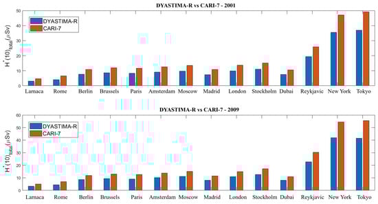 For this reason, a comparison was made between the values obtained with DYASTIMA-R and those from the Federal Aviation Administration’s (FAA) internationally recognized CARI-7 software, one of the oldest models available for radiation assessment [44]. The comparison was performed for the years 2001 and 2009, taking FL350 as the flight altitude, and it is presented in Figure 4. It is observed that the values obtained with DYASTIMA-R are similar to those obtained with CARI-7. Small deviations are observed for flights of short and medium durations (approximately 20%), while the largest deviations (approximately 30%) are observed for the two long-duration flights (Athens–New York and Athens–Tokyo), both in 2001 and 2009, respectively. The difference is due to the systematic errors of the DYASTIMA input parameters, as they are mostly based on models, as well as the simplified flight profile which does not take into consideration changes in flying altitude during the flight (for example, lower or higher FLs), take-off and landing, as well as the actual route of the plane. Furthermore, each model requires different solar parameters. For example, DYASTIMA-R uses the differential primary cosmic ray spectrum (in this work provided by ISO15390 model, as retrieved by using the tool OMERE by TRAD), while CARI-7 takes into account the solar activity by using the sunspot number. But, regardless of the different parameters they use as input, they also use different numerical methods for extracting the results. More precisely, CARI-7 uses the MCNPX method while DYASTIMA-R uses the Geant4 method. So, it is obvious that the results will be biased differently with different systematic errors. Many benchmark tests have been carried out for the performance of these two methods [45,46].