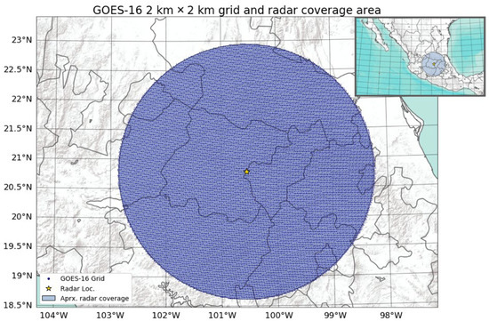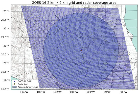 The data used in this study came from two sources. The first was from NOAA’s GOES-16 satellite, using the CONUS sector, and the second was from the Queretaro weather radar. The analysis period spanned 47 days, from 1 July 2018 to 16 August 2018, representing the time when the radar dataset was most complete during the rainy season.