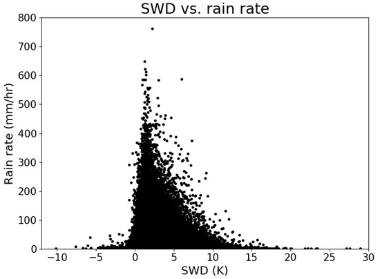 A notable distinction between the distributions of no rain cases and rain cases was the frequency of occurrences above and below 2.5 K. For the distribution of cases without rainfall, 37.2% exhibited SWD values lower than 2.5 K, whereas for the distribution of rain cases, 82.2% of cases had SWD values below 2.5 K, suggesting that SWD values below 2.5 K were commonly associated with precipitation.