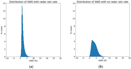 In this part of the study, each pixel in the common grid was considered a case, using pixel-by-pixel comparison. Figure 3 illustrates the relationship between SWD and radar rain rate, revealing that the majority of rain rate cases shows a positive SWD. Extreme rain rates (100 mm/h or above) were associated with SWD values ranging from 0 K to 5 K, with an average of 1.99 K. Figure 4 displays the distributions of the SWD for pixels with rain (left graph) and pixels without rain (right graph). The left graph of Figure 4 suggests that most cases where precipitation occurrence had an SWD between 0 K and 5 K, with the highest percentage of cases (13.5%) falling within the 1.23 K and 1.44 K interval. Conversely, for the non-rain cases displayed in Figure 4b, the majority of cases exhibited SWD values between 0 K and 10 K, with a significant concentration between 5 and 10 K. The highest percentage of cases (4.1%) occurred within the SWD range of 1.86 K to 2.07 K. The main differences observed between the no rain cases distribution and the rain cases distribution was the number of cases above and below 2.5 K.