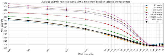 Graphs of the average SWD for each offset time (offset between the radar data and the SWD data) for all cases and for the rain rate intensity intervals indicated. Negative times on the x-axis indicate the time before the measurement of rain rate (0 min is time of measurement of rain rate).