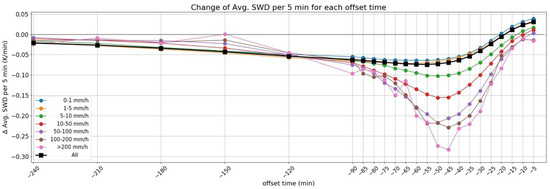 Graphs of the change in the average SWD per 5-min for each offset time (offset between the radar data and the SWD data) for all cases and for the rain rate intensity intervals indicated. Negative times on the x-axis indicate the time before the measurement of rain rate (0 min is time of measurement of rain rate).