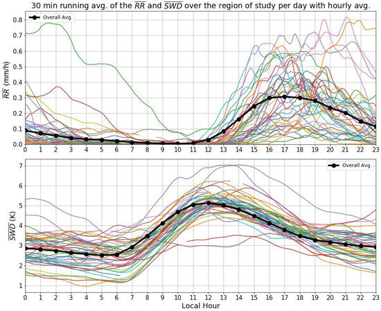 Figure 7 shows the running mean for all available days for the RR_aa and the SWD_aa, as well as the hourly average of both. The mean values show that rainfall typically commenced after 11 h. local time, with a maximum around 17 h. local time. On the other hand, the SWD_aa tended to increase at around 6 h. local time and its maximum occurs at 12 h. local time. The behavior of RR_aa is consistent with the observed diurnal cycle of precipitation in various regions during the rainy season [43,44,45]. The graphs also highlight the inverse relationship between SWD_aa and the presence of precipitation, with a noticeable decrease in SWD_aa coinciding with an increase in RR_aa. Additionally, the rise in SWD observed around 6:00 a.m. local time corresponds to the sunrise, indicating a decrease in low-level water vapor levels with the presence of sunlight. It is important to emphasize that both SWD_aa and RR_aa were averages over the entire region, considering all areas where there is no rain rate as 0.0 mm/h. Consequently, the observed maximum and minimum SWD_aa values exceeded those reported in the previous section.