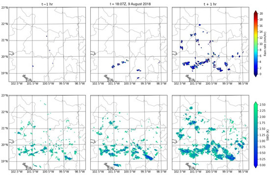 Rain rate from the Queretaro radar (top images) and SWD field below 2.5 K from the GOES-16 satellite (bottom images) for the event starting at 18:07 Z, 9 August 2018. Left images are for one hour before start of event, middle images are of start of event and right images are of 1 h after start of event.