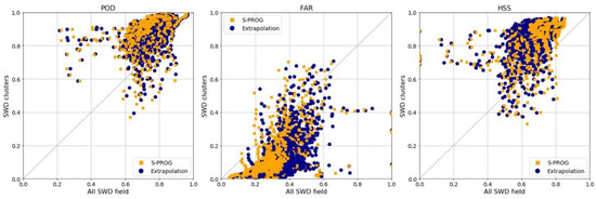 Figure 10 shows the scatter plots of the statistics used to evaluate the two nowcast models, comparing the results between the SWD field (All SWD field) and the SWD clusters (SWD clusters). The scatter plots indicate that SWD clusters provided better overall results. The PoD, FAR and HSS results show that the Extrapolation and S-PROG models were accurate in general, with approximately 93% of cases with PoD of 0.7 or higher, 71% of the cases had a FAR below 0.3, and 68% of the cases had a HSS at or above 0.7. Figure 11 presents all the average statistics in every 5-min interval of the analysis period and the difference between the average results obtained using the SWD field and SWD clusters. The graphs illustrate that the results improved as the time elapsed. Finally, the SWD clusters gave more accurate forecasts throughout the whole period of analysis. Although several nowcast models use satellite data [23,24,25,26,27,28,29,30,31,32], there have been no prior studies employing SWD satellite data as inputs in the pySTEPS nowcast models. While some studies have utilized the optical flow fields available in pySTEPS with satellite data [46] and not the nowcast models themselves, certain studies have evaluated S-PROG and Extrapolation pySTEPS nowcast models with radar data, using some of the same dichotomous statistics. The authors of [8,11,12] conducted evaluations of the two models in the USA (former two) and China, respectively, with radar data for precipitation events. Their PoD and FAR results closely resemble those obtained with the SWD data, with values between 0.6 and 0.75 for average PoD and values between 0.2 and 0.4 for average FAR for lead times near 15 min. However, because [8,11,12] involved radar data rather than satellite data, caution should be exercised when comparing these results with those obtained using the SWD.