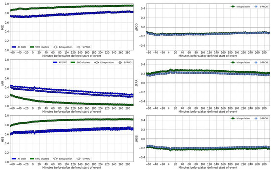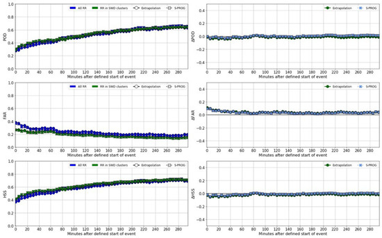 Graph of the average statistics indicated (POD, FAR, HSS) of the 15-min forecast, using the image of the time indicated as input (graphs on right column) and the difference between “All SWD” and “SWD clusters” (left column, marked with a ∆). The time is every 5-min interval before (marked with a negative sign) and after the defined start of the event for SWD data.
