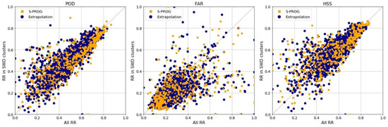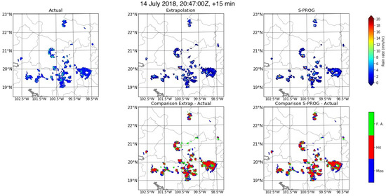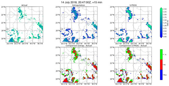 Figure 13 shows the scatter plots results for the two models; the results for the PoD and HSS show that using all_RR was less accurate than using RR_in_SWD_clusters. For both models, the PoD of 93% of cases fell below 0.7 and the PoD of 58% of cases fell between 0.7 and 0.5. For the FAR, 87% of the cases were below 0.3. The difference between using as input all_RR and RR_in_SWD_clusters was negligible. Figure 14 shows statistics results for a 15-min forecast, averaged for every 5 min interval after the start of the rain event. These graphs show that, on average, using all_RR field resulted in similar forecast as using RR_in_SWD_clusters. Additionally, the PoD tended to increase on average by almost 0.4 in the 295 min after the start of the event, the FAR decreased by 0.2 in the same period. These results for all_RR are not as accurate as those obtained by previous works. The authors of [8] evaluated the models for 10 events in the Texas, USA region and obtained PoD values of 0.6 and 0.75 for Extrapolation and S-PROG, respectively, and FAR values between 0.3 and 0.4 for both models. The authors of [11] used 80 events from Texas and Colorado, USA, and radar reflectivity with S-PROG and Extrapolation, which resulted in average PoD of approximately 0.75 and average FAR of 0.2 for the 15-min lead time. Lastly, the authors of [12] used the Extrapolation and S-PROG models with radar reflectivity data from China for over 100 events. They found that for short lead times (12 and 24 min), the POD reached 0.75 and the FAR was below 0.2. However, the PoD values were closer to those observed by [8,11,12] as the events developed. Finally, an example of these forecasts (Figure 15) showed similar observations as those made with the SWD data for the same event, revealing comparable results between the Extrapolation and S-PROG models. Additionally, both models tended to overestimate the area affected by rainfall.
