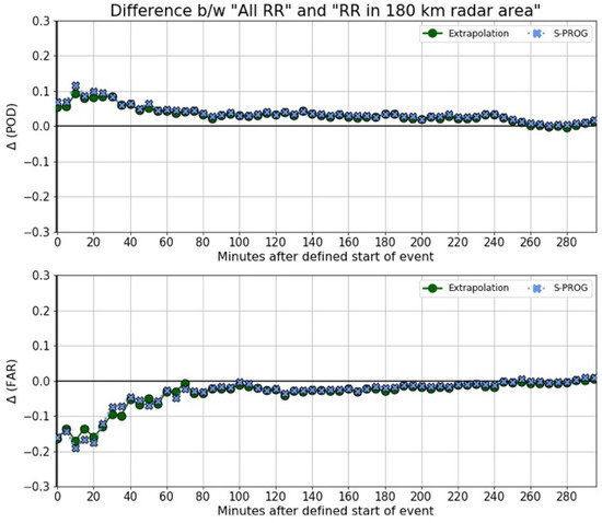 Previous results showed that the nowcasts gave less accurate results when radar data were used as input. This might be due because the radar has some limitations in the coverage area. To explore if this limitation had any effect in the results, the nowcast models were evaluated by applying two radar coverage area limits. The first constraint was the whole radar coverage area (all radar area; Figure 1); and the second was a constrain the radar range to 180 km (180 km radar area). Figure 16 shows the differences in the average PoD and FAR between all radar area, and 180 km radar area. The 180 km radar area demonstrated improved results for both PoD and FAR during the initial 60 min following the event’s commencement. However, this improvement diminished to less than 0.05 for the subsequent period.