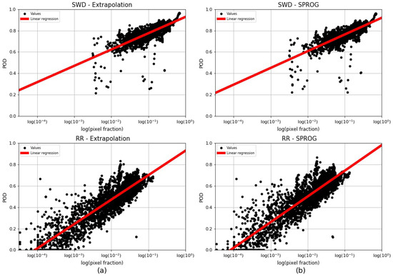 Scatter plot of the log-10 of the pixel fraction (real data pixels over total pixels) and the PoD for the events analyzed. Bottom graphs are of radar rain rate and top graphs are for SWD results for (a) Extrapolation and (b) S-PROG.