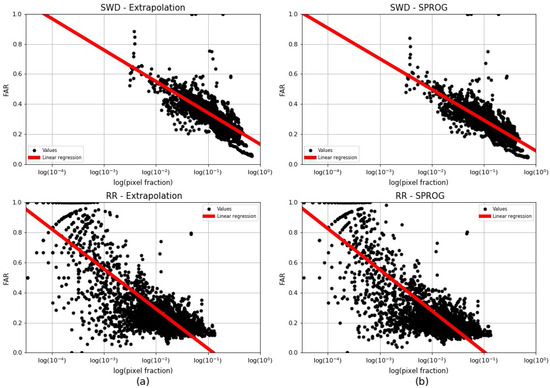 Figure 17 shows the scatter plot of the logarithm-10 of the fraction of pixels in each image with real data (pixel fraction) and the PoD for each nowcast model divided into SWD and radar data, as well as their linear correlation for the two nowcast models. All data sets had a positive, linear correlation with the log-10 of pixel fraction. For the SWD data, the data were more concentrated in the PoD values above 0.5, but the outliers present were very separated from the main cluster of data. For the radar data, the data remained below 0.8 and were more scattered, unlike the SWD, which did not have many outliers very separated from the main data cluster. Figure 18 shows the same but for FAR. This variable has a negative, linear correlation with the log-10 of pixel fraction. The SWD data were less spread with some outliers, and the radar data were more spread, especially for pixel fraction values below 0.003 (approximately 186 pixels). The linear correlation observed in the graphs was calculated using the Pearson’s correlation (R) and Spearman’s Rank (rho) (Table 1). This table shows R and rho values for each of the statistics studied and the log-10 of the pixel fraction. All variables showed a high correlation with pixel fraction, except for the HSS for SWD, which had a moderate correlation.