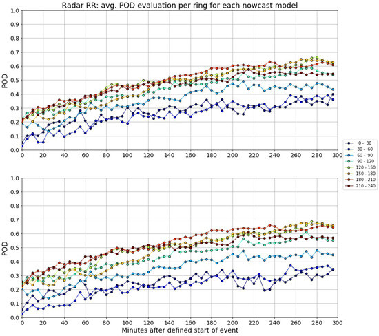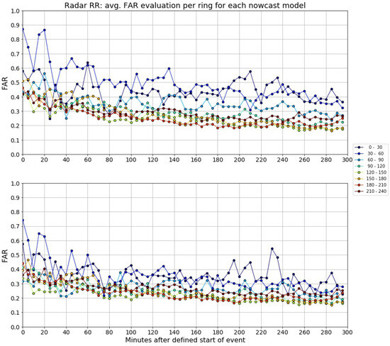 An initial assessment was to observe how the nowcast skill varied with radar range. This was performed by dividing the radar coverage area into rings, 10 km in width, and obtaining the evaluation statistics for each ring. Figure 19 shows the average PoD and FAR per outer ring radius. For PoD, the average value was around 0.2 near the radar, and increased gradually until reaching 40 km, when the PoD decreased to slightly less than the initial value and continued with a gradual increase up to 0.5 at 120 km. This value was constant up to 220 km, then there was slight decrease to 0.4 in PoD for the outer-most radiuses. FAR, the opposite behavior, started near 0.40 and maintained these values until 50 km, where a peak occurred, followed by gradual decrease to around 0.2–0.3 at 120 km, remaining constant up to 220 km, and ending with a slight increase. Additionally, there was larger difference between SPROG and extrapolation nowcast of around 0.05 for all radiuses up to 170 km. Figure 20 and Figure 21 show the average PoD and FAR across distance rings per time after the start of the rain events, for each nowcast model. The averages were obtained for 30 km rings for these graphs for clarity. These graphs show that the PoD was low for rings closest to the radar and increased as the distance from the radar increases, and the opposite occurs for FAR. The slight decrease in the models’ skill in the outer rings that was observed in Figure 19 can also be observed in these graphs, especially after 120 min after the start of the events. Additionally, the PoD tended to increase with time and the FAR decreased with time.