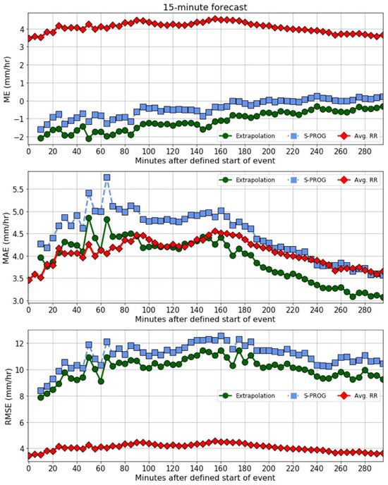The previous sections presented the nowcast evaluations using dichotomous verification statistics, which were used because the intensities of the satellite products are not expected to be correctly predicted by the nowcast models developed for radar data. Nevertheless, to complete the evaluation of the nowcast models for the rain rate, a brief analysis on how both nowcast models predict the intensity of the rain rate provided by the Queretaro weather radar was performed. Figure 22 shows the average mean error (ME), mean absolute error (MAE) and the root mean standard error (RMSE) for each model, all obtained through the pySTEPS functions, for the 15-min forecast obtained every five minutes for the 295 min after the start of the events. The ME indicates that the models tended to underestimate more on average the rain rate for the first 165 min. The MAE showed that mean magnitude of the errors was generally below 4.5 mm/h for Extrapolation and decreased to around 3 mm/h at the end of the period of analysis, indicating that the errors in intensity tended to decrease as the events grew and evolved. A similar behavior was observed for S-PROG, but the errors were around 0.5 mm/h higher. Finally, the RMSE for Extrapolation started around 8 mm/h, and increased to approximately 11 mm/h at 160 min after the start of the events, followed by a decrease to around 9 mm/h by the end of the analysis. A similar pattern was observed for S-PROG with an increase of 0.5 mm/h. The results in comparison with the work of [8] are far better. The authors of [8] analyzed 10 events in Texas and obtained an MAE of between 11 mm/h and 12 mm/h on average. Additionally, the authors of [11] tested both S-PROG and Extrapolation among other models and found that the MAE was higher for S-PROG than Extrapolation, although [11] results were obtained comparing radar reflectivity and were presented as an average for various minimum reflectivity thresholds.