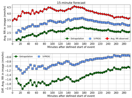 Average mean rain rate for the output image of the 15-min forecast, obtained using the images in every 5-min interval as input image, for the Extrapolation and S-PROG nowcast in the 295 min after the start of the events; and the average mean rain rate of the image observed in the interval.