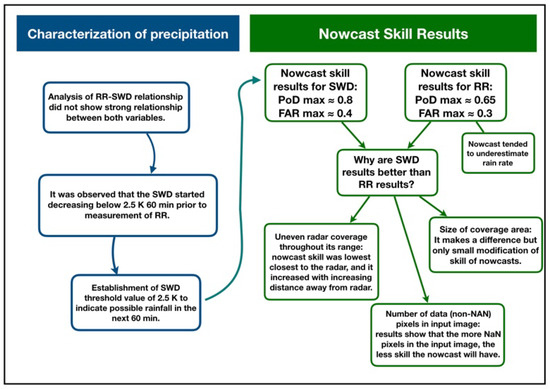 Furthermore, while the SWD fell below 2.5 K around 60 to 90 min before the rainfall event, not all areas of SWD that fell below 2.5 K developed into rain. These observations indicate that the SWD is not enough to detect a precise area of future rain development. This study only used the SWD because it lacked any other tools and other sources of data that could provide more information on the atmospheric condition of the whole area of study. As mentioned in the introduction, Mexico lacks a nationwide rain gauge system or a comprehensive meteorological station network, with the ones that exist being very scatter around the country to provide the necessary spatial resolution for these types of nowcast systems to function efficiently. Moreover, the authors also explored the use of other GOES-16 satellite products but found several to be unavailable at in the region in the period of analysis, and the ones that were available did not have a clear relationship with rain rate or the development of rainfall like the SWD did. Regardless, once the data sets for the other GOES-16 products become available for the region, future research can use these satellite products to further examine the precipitation that occurs in the region with the radar data, as well as determine more precise locations for future precipitation along with the SWD.